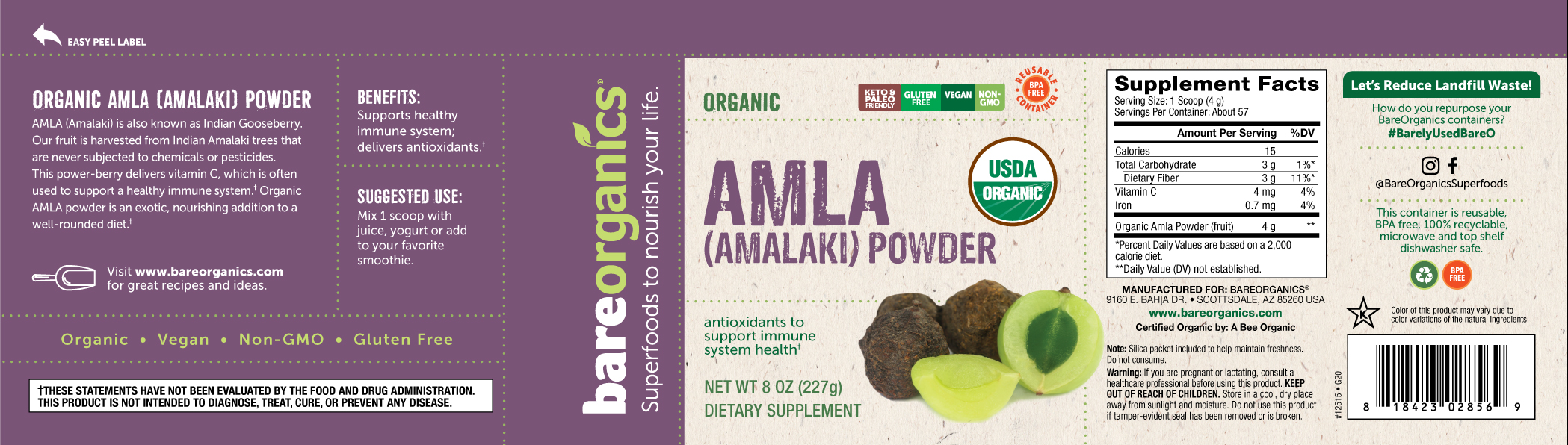 AMLA (Amalaki) от BareOrganics представлява прахообразен екстракт от т. нар. индийско цариградско грозде. Суровината за продукта се взима от индийски дървета Амалаки, които никога не са имали досег с химикали или пестициди.