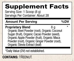 Съставките на Energy & Stamina Blend включват мощна смес от цвекло, какао, мака, корен от джинджифил и ябълка и е леко подсладена с натурална стевия и кокосова захар, което я прави лесна и вкусна за добавяне на стимул към деня ви!