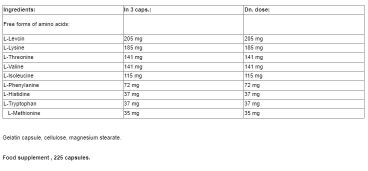 Съставки: L-левцин, L-лизин, L-треонин, L-валин, L-изолевцин, L-фенилаланин, L-хистидин, L-триптофан, L-метионин