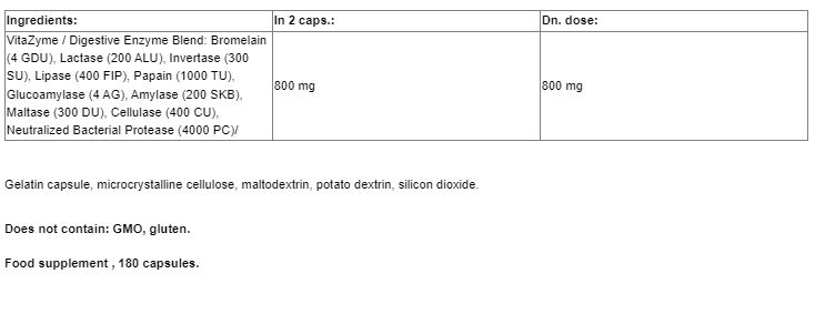 Съставки: Бромелаин, лактаза, инвертаза, липаза, папаин, глюкоамилаза, амилаза, малтаза, целулаза, неутрализирана бактериална протеаза