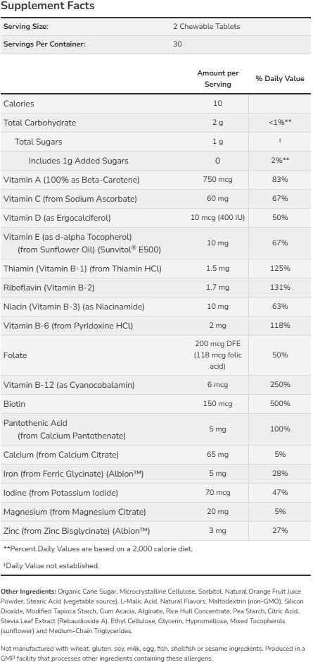 Съставки: Лутеин, ликопен, минерали, калий, калций, магнезий, цинк, манган, хром, йод, желязо, молибден, витамини, витамин B6 - пиридоксин, витамин B3 - ниацин, витамин A, витамин C, витамин E, витамин D, витамин B1 - Тиамин, Витамин B2 - Рибофлавин, Витамин B9 - Фолиева киселина, Витамин B12 - Цианокобаламин, Витамин B7 - Биотин, Витамин B5 - Пантотенова киселина, Инозитол, Холин битартарат, Витамин B10 - PABA