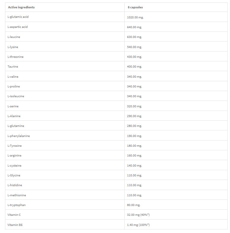 Съставки: Аминокиселинен комплекс, L-Leucine, L-lysine, L-Isoleucine, L-Valine, L-Phenylanine, L-Threonine, L-Histedine, L-Methionine, L-Tryptophane