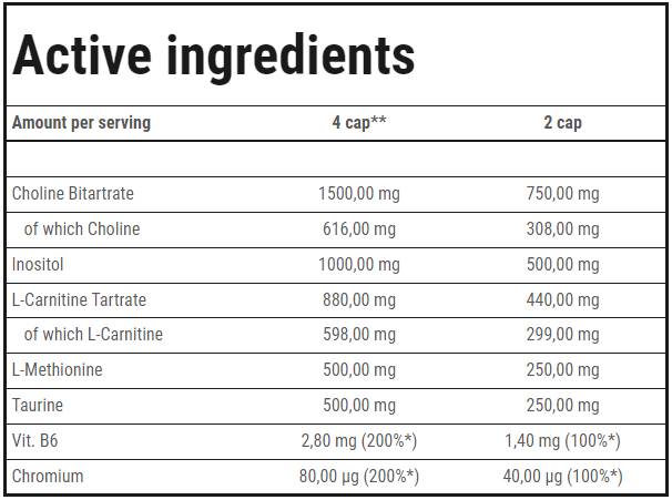 Всяка доза съдържа: холин битартрат 750.00mg, от които холин 308,00mg, инозитол 500,00mg, L-карнитин тартарат 440,00mgот които L-карнитин 299,00mg, L-метионин 250,00mg, таурин 250,00mg, витамин В6 1,40mg, хром 40.00mcg, витамин B5