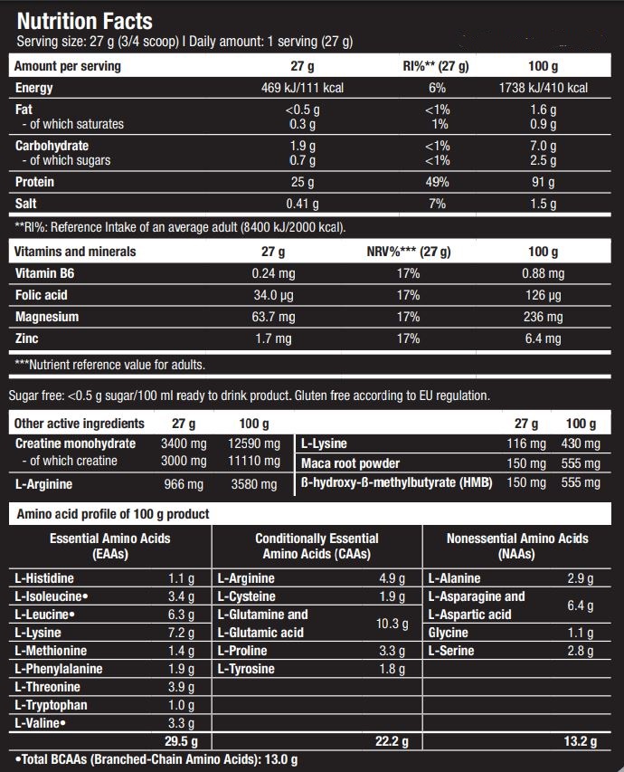 Съставки: суроватъчен протеинов изолат, суроватъчен протеинов хидролизат, креатин монохидрат (12.6%), L-аргинин (3.6%), хидроксиметилбутират (0.7%), цинк, магнезий, витамин Б6, L-левцин, L-изолевцин, L-валин, овкусители: ацесулфам –К и сукралоза; сол