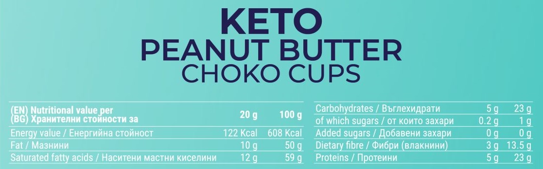 FIT FAST Keto Peanut Butter Choco Cups съдържа само 2 грама нетни въглехидрати и е без добавена захар. Това го прави изключително подходящ за хора, които искат бързо да влязат във форма и да свалят излишните килограми.