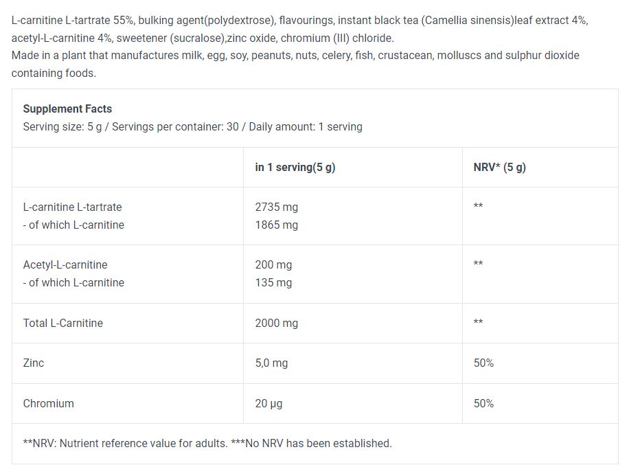 Съставки: L-карнитин L-тартарат 55%, пълнител (полидекстроза), аромати, разтворим черен чай (Camellia sinensis) екстракт от листа 4%, ацетил-L-карнитин 4%, подсладител (сукралоза), цинков оксид, хром (III) хлорид