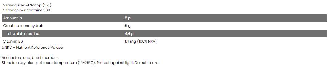 Съставки: Креатин монохидрат, витамин В6 (пиридоксин хидрохлорид)