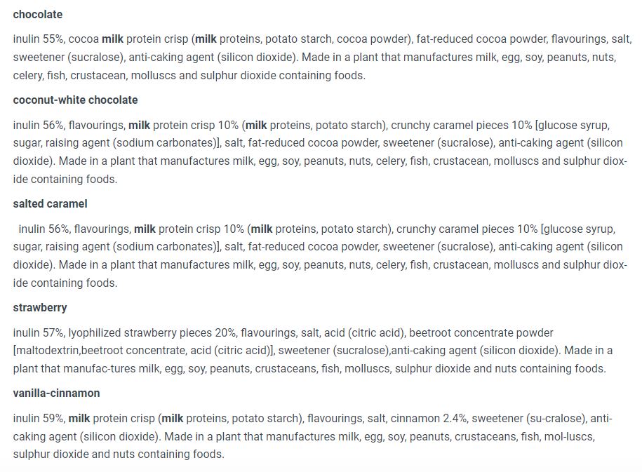инулин 55%, какаов млечен протеин crisp (млечни протеини, картофено нишесте, какао на прах), какао на прах с намалено съдържание на мазнини, овкусители, сол, подсладител (сукралоза), антислепващ агент (силициев диоксид).