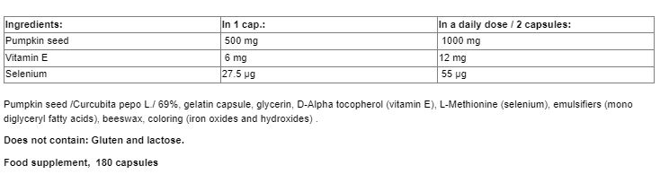 Съставки: тиквено семе /Curcubita pepo L./ 69%, желатинова капсула, глицерин, D-Алфа токоферол (витамин Е), Л-Метионин (селен), емулгатори (моно диглицерил мастни киселини), пчелен восък, оцветител (железни оксиди и хидроксиди)