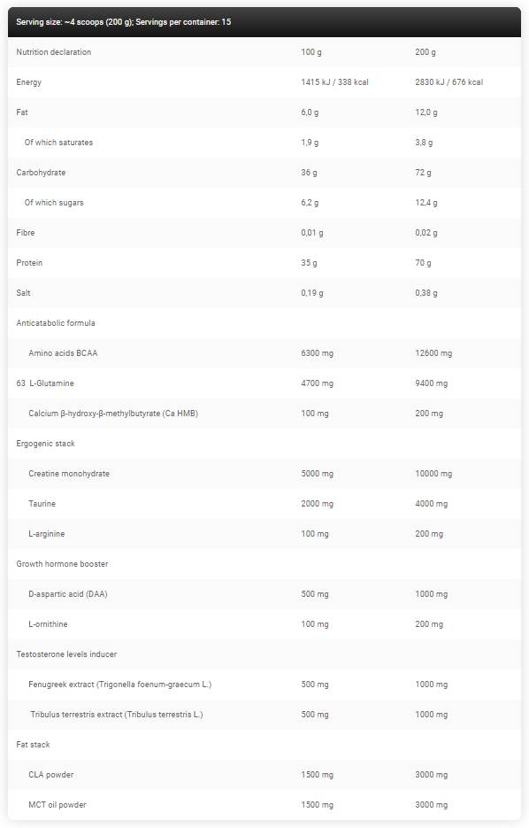 Съставки: протеинов комплекс [суроватъчен протеин изолат (от мляко), суроватъчен протеин концентрат (от мляко), хидролизиран суроватъчен протеин концентрат (от мляко)], въглехидратен комплекс (малтодекстрин, глюкоза), креатин монохидрат, CLA на прах, MCT масло на прах, L-глутамин, какао, таурин, какао, разтворимо кафе, D-аспарагинова киселина (DAA), екстракт от сминдух (Trigonella foenum-graecum L.), екстракт от трибулус терестрис (Tribulus terrestris L. ), калциев β -хидрокси- β -метилбутират (Ca HMB), L-аргинин, L-орнитин, сгъстител (ксантанова гума), концентрат на сок от червено цвекло, ароматизанти, овкусител, оцветител/и (Е1634, Е160а, Е150с)