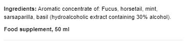 Съставки: ароматен концентрат от: фукус, полски хвощ, мента, сарсапарила, босилек (хидроалкохолен екстракт, съдържащ 30% алкохол)