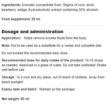Съставки: ароматен концентрат от: стигма от царевица (царевична коса), бреза, мeчо грозде, пирей (корен) (хидроалкохолен екстракт, съдържащ 30% алкохол)