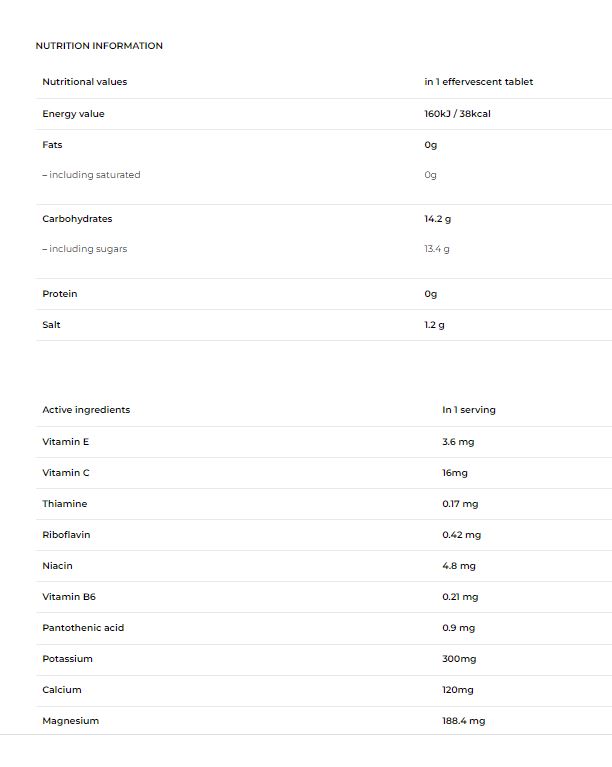 Една доза от напитката съдържа балансирана доза витамини, която е приблизително 20% от препоръчителния дневен прием. Благодарение на оптималната концентрация на въглехидрати и електролити, близки до телесните течности, напитката хидратира организма много по-бързо и по-ефективно и утолява жаждата, отколкото обикновената вода. По този начин тя допринася за поддържането на правилния електролитен баланс на организма, който е съществен елемент от правилното му функциониране.