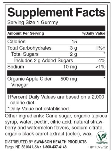 SWANSON Apple Cider Vinegar Gummies. Тези веган дъвчащи бонбони на пектинова основа доставят 500 mg органичен ябълков оцет на порция в сладък и сочен вкус на ягода и диня.