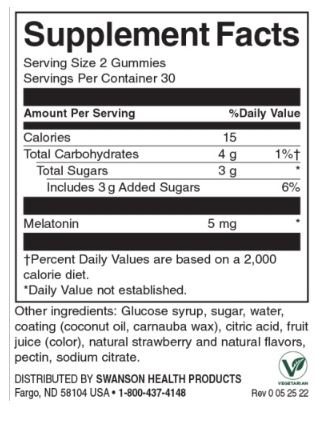 SWANSON Melatonin Gummies предлага начин да изпробвате мелатонин без таблетки с мощно съдържание от 5 мг в сладък вкус на ягода. Мелатонинът е клинично изследван - най-често в дози от 1-5 mg дневно - заради потенциала му да подобрява качеството и количеството на съня, така че да заспивате по-бързо и да оставате заспали по-дълго.