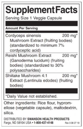 SWANSON Cordyceps Complex с гъби рейши и шийтаке съдържа най-съвременни екстракти от тези три уважавани гъби защитници, стандартизирани за осигуряване на постоянни концентрации на активни съставки за гарантирана ефикасност във всяка вегетарианска капсула.