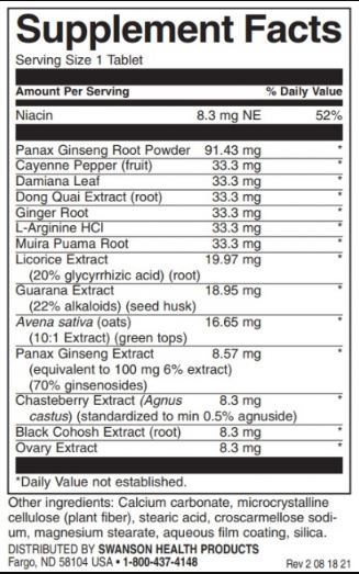 SWANSON Ultimate Women's Intimate Performance съдържа: Ниацин Корен от женшен Лют червен пипер Листа от дамиана Екстракт от донг куай Корен от джинджифил L-ArginineКорен от муира пуама Екстракт от женско биле Екстракт от гуарана Avena sativa (овес) Екстракт от Panax GinsengЕкстракт от Chasteberry Екстракт от черен кохош