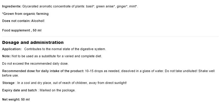 Съставки: ароматен концентрат от: босилек, мента, чубрица, лимонова върбинка, анасон