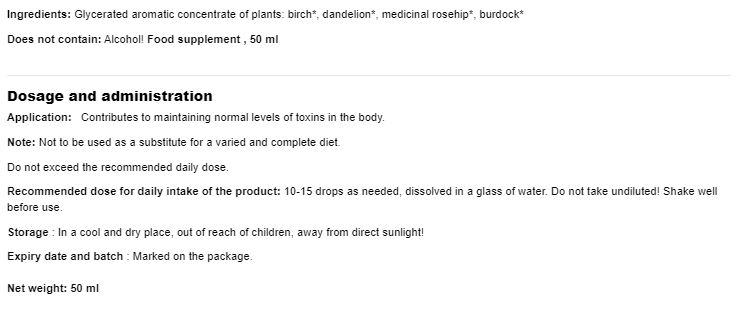 Съставки: ароматен концентрат от: бреза, репей, глухарче, лечебен росопас, сарсапарила