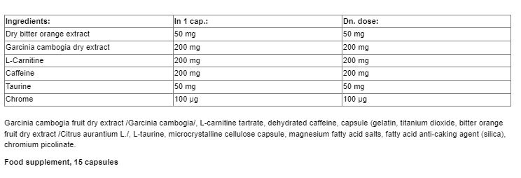 Съставки: Сух екстракт от плод на гарциния камбоджа,горчив портокал, Л-карнитин, кофеин, таурин, хром.