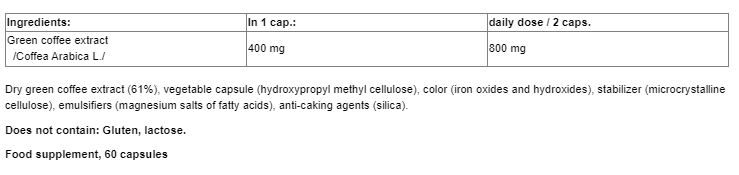 Съставки: (в 1 капсула) зелено кафе екстракт (400 мг.) /Coffea Arabica L./, сух екстракт от зелено кафе (61%), растителна капсула (хидроксипропил метил целулоза), оцветител (железни оксиди и хидроксиди), стабилизатор (микрокристална целулоза), емулгатори (магнезиеви соли на мастни киселини), антислепващи агенти (силициев диоксид)