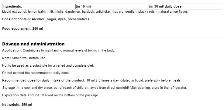 Съставки: Течен екстракт от: маточина, бял трън, глухарче, репей, артишок, ревен, тинтява, черна ряпа, естествен аромат на анасон.