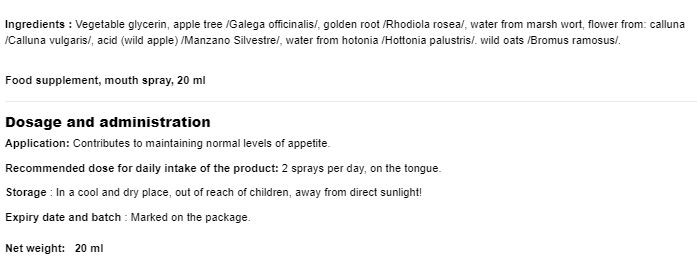 Начин на употреба: По 2 впръсквания дневно, върху езика.