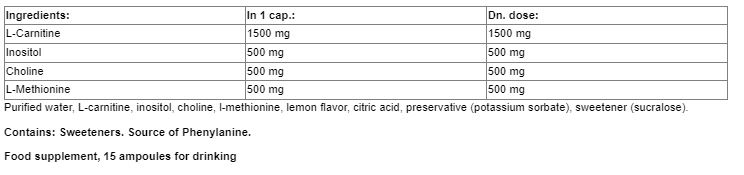 Съставки: Л-карнитин, инозитол, холин, л-метионин, сукралоза.