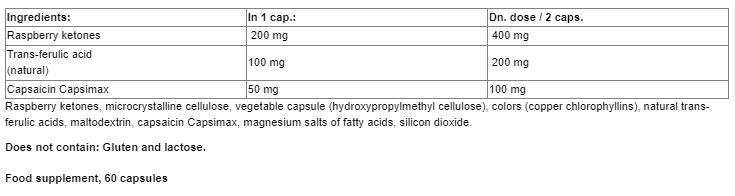 Съставки: Малинови кетони, Транс-ферулова киселина (натурална), Капсаицин.
