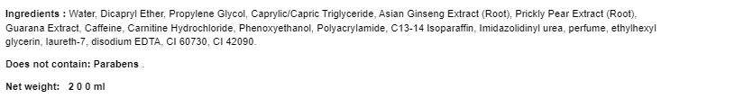Състав: вода, пропилен гликол, екстракт от женшен, екстракт от бодлив залист, екстракт от гуарана, кофеин, карнитин хидрохлорид, феноксиетанол..