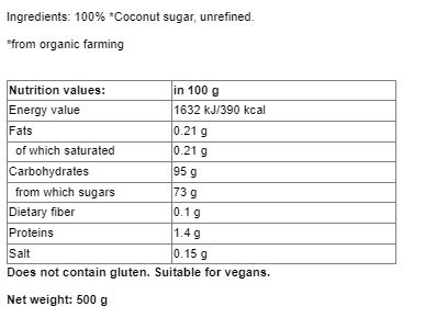 Съставки: 100% Кокосова захар, нерафинирана. Не съдържа глутен!