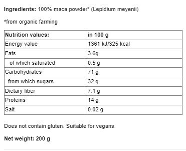 Съставки: 100% мака на прах (Lepidium meyenii)