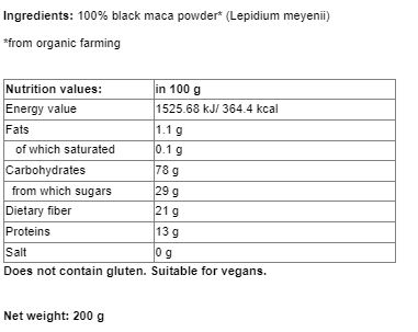 Черната мака притежава приятен и сладникав вкус, като естествено се среща в централните Анди. Тя е страхотна добавка към всяко ястие, защото не влияе на вкуса им и не е натрапчива. Черната мака е известна и с мощните си свойства на афродизиак – тя не само подобрява сексуалната функция и укрепва половата система, но и повишава качеството на сперматозоидите.