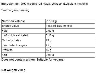 MYCONATUR Organic Red Maca Powder съдържа във формулата си обилно количество витамини В, С и Е, минералите цинк, желязо, калций, магнезий, фосфор, както и различни стероли, танини, ситостероли, сапонини, алкалоиди, стигмастероли, фибри, мастни киселини, аминокиселини, белтъци и въглехидрати.