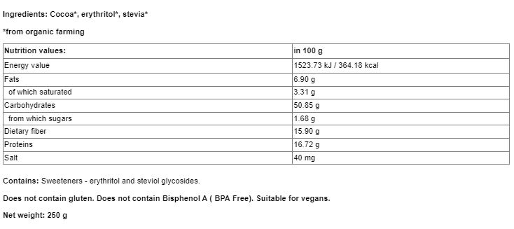 MYCONATUR Natural Organic Cocoa Powder е висококачествено 100% натурално какао на прах, към което не е добавена захар. Вместо това, към него е добавен естественият подсладител стевия.