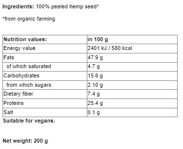 MYCONATUR Peeled Organic Hemp Seed съдържа 100% натурално белено конопено семе, произведено според принципите на устойчивото земеделие. Конопеното семе е древна култура, която има дълги корени на употреба в Китай и Индия, където е било използвано както заради своите лечебни средства, така и заради хранителните му свойства, по-конкретно – високото съдържание на белтъци.