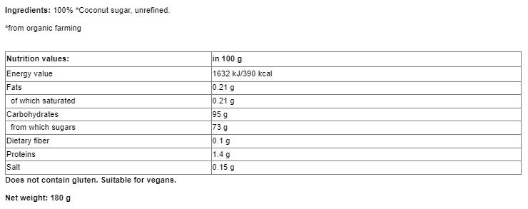 Съставки: 100% Кокосова захар, нерафинирана. Не съдържа глутен!