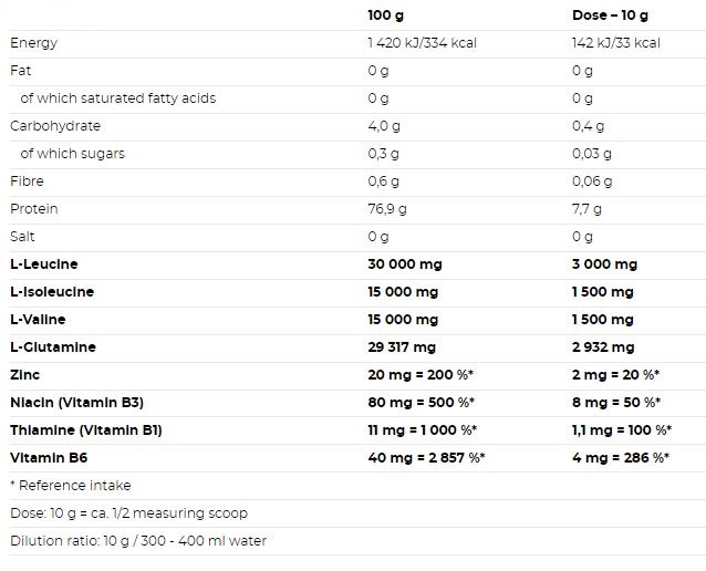 Съставки: смес от инстантни BCAA (L-левцин, L-изолевцин, L-валин, емулгатор слънчогледов лецитин), L-глутамин, оцветител карамел, регулатор на киселинността лимонена киселина, ароматизатор, подсладители ацесулфам К и сукралоза, антислепващи агенти калциев фосфат и силициев диоксид, цинков глюконат, никотинамид, пиридоксин хидрохлорид, тиамин хидрохлорид