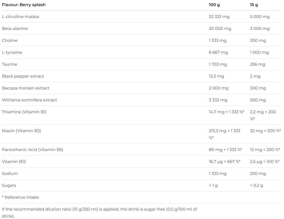 Съставки: L-цитрулин малат, бета-аланин, глицерол моностеарат, L-тирозин, аромат, противослепващ агент силициев диоксид, холин L-битартрат, екстракт от Withania somnifera, натриев цитрат, екстракт от Bacopa monnieri, таурин, натриев хлорид, антислепващ агент калциев фосфат, концентрат от черни моркови, подсладители сукралоза и стевиол-гликозиди, никотинамид, калциев D-пантотенат, тиамин хидрохлорид, екстракт от черен пипер - Bioperine®, цианокобаламин.