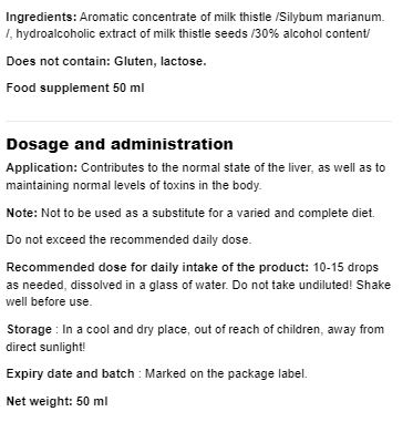 Съставки: ароматен концентрат от бял трън /Silybum marianum/, хидроалкохолен екстракт от семена на бял трън /30% съдържание на алкохол/