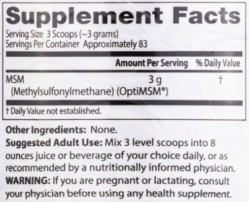 Основната съставка в MSM Powder with OptiMSM е OptiMSM, високо пречистена форма на метилсулфонилметан. МСМ е естествено срещащо се съединение на сярата, което играе решаваща роля в поддържането на структурата на протеините, защитата на клетките и клетъчните мембрани и подпомагането на имунната система.