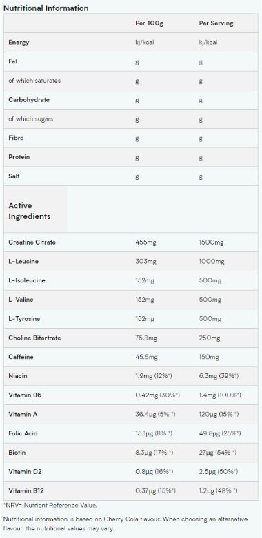 Съставки: газирана вода, BCAA 2:1: 1 (L-левцин, L-изолевцин, L-валин, L-тирозин, холин битартрат, зърна зелено кафе, прах от семена на гуарана (Paullinia cupana), ниацин, витамин В6, фолиева киселина, биотин, витамин D2, витамин В12), креатин монохидрат, регулатори на киселинността (лимонена киселина, ябълчена киселина), подобрител на вкуса (естествен аромат), оцветител (антоцианини), консерванти (калиев сорбат, натриев бензоат), разтвор на витамин А (вода, витамин А), подсладител (сукралоза)