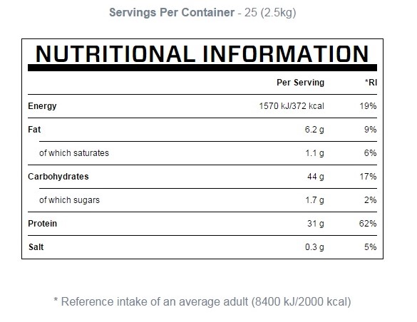 Съставки: смлян овес (65%), протеинова смес (30%) (суроватъчен протеин концентрат (мляко), млечен протеин концентрат, емулгатор (соев лецитин), малтодекстрин