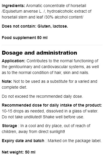 Съставки: Ароматен концентрат от полски хвощ /Equisetum arvense L/, хидроалкохолен екстракт от стъбло и лист на полски хвощ /30% съдържание на алкохол/