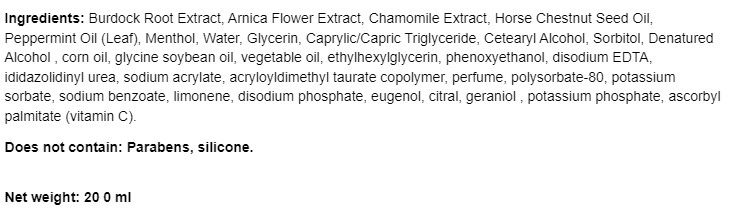 Съставки: Екстракт от корен на бодлив залист, екстракт от арника цвят, екстракт от лайка, масло от семена на конски кестен, масло от мента (лист), ментол, вода, глицерин