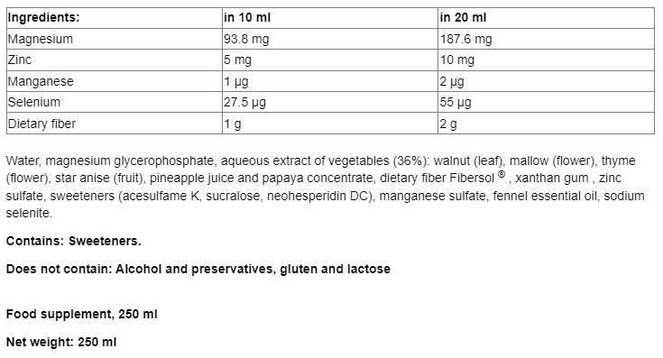 Балансирана комбинация от разтворими растителни екстракти, микроелементи и пребиотици (фибри) за подпомагане на храносмилането и подобряване на чревния транзит. Приемайте по 10 ml (1 мерителна чаша), разтворени в малко количество вода или приемани директно, два пъти дневно, за предпочитане между храненията.