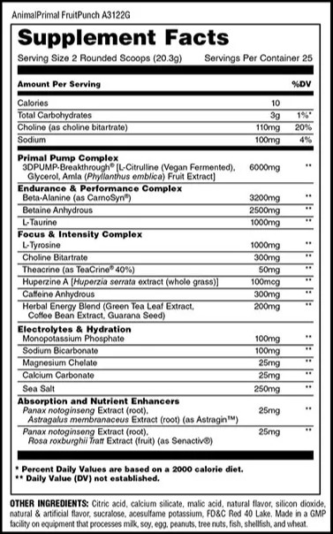 Съставки: Холин (като холин битартрат), натрий, Primal Pump Complex 3 DPUMP-Breakthrough [L-цитрулин (веган ферментирал), глицерол, екстракт от плодовете на амла (Phyllanthus emblica)] Комплекс за издръжливост и ефективност Бета-аланин (като CarnoSyn), бетаин безводен, L-таурин, комплекс за фокус и интензивност L-тирозин, холин битартрат, теакрин (като TeaCrine 40%), хуперзин А [екстракт от Huperzia serrata (цяла трева)], кофеин безводен, билкова енергийна смес (екстракт от листа на зелен чай, Електролити и хидратация Монокалиев фосфат, Натриев бикарбонат, Магнезиев хелат, Калциев карбонат, Морска сол, Подобрители на усвояването и хранителните вещества Екстракт от Panax notoginseng (корен), Екстракт от Astragalus membranaceus (корен) (като Astragin), Екстракт от Panax notoginseng (корен)