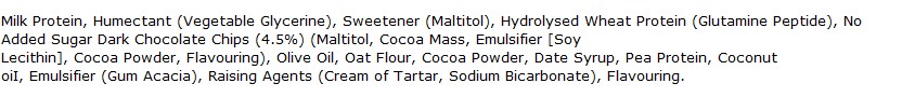 Съставки: млечни протеини, овлажняващ крем (растителен глицерин), подсладител (малтитол), хидролизиран пшеничен протеин (глутаминов пептид), парченца черен шоколад без добавена захар (4. 5 %) (малтитол, какаова маса, емулгатор [ соев лецитин ], какао на прах, аромат), зехтин, овесено брашно , какао на прах, сироп от фурми, грахов протеин, кокосово масло, емулгатор (акациева гума), ароматизатори (крем от винен камък, натриев бикарбонат), аромати