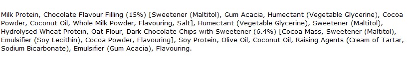 Съставки: млечни протеини, аромат на бял шоколад (15%) [малтитол, акациева гума, кокосово масло, пълномаслено мляко на прах, растителен глицерин, зехтин, аромат, сол, оцветител (бета-каротин)], овлажняващ крем (растителен глицерин), подсладител (малтитол), хидролизиран пшеничен протеин, соев протеин, парченца черен шоколад с подсладител (5. 5%) (подсладител (малтитол), какаова маса, емулгатор [соев лецитин], какао на прах, аромати), овесено брашно, зехтин, какао на прах, кокосово масло, подкваса (крем от винен камък, натриев бикарбонат), акациева гума, ароматизатор
