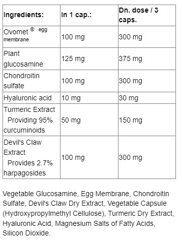 Форте Долозеро Плантис с яйчна мембрана - овомет, глюкозамин, хиалуронова киселина, хондроитин сулфат, куркума и харпагофито. Мембраната от яйца Одомет, благодарение на богатия си състав от хиалуронова киселина, колаген и глюкозамин, се характеризира с противовъзпалително, обезболяващо и регенериращо хрущяла действие.